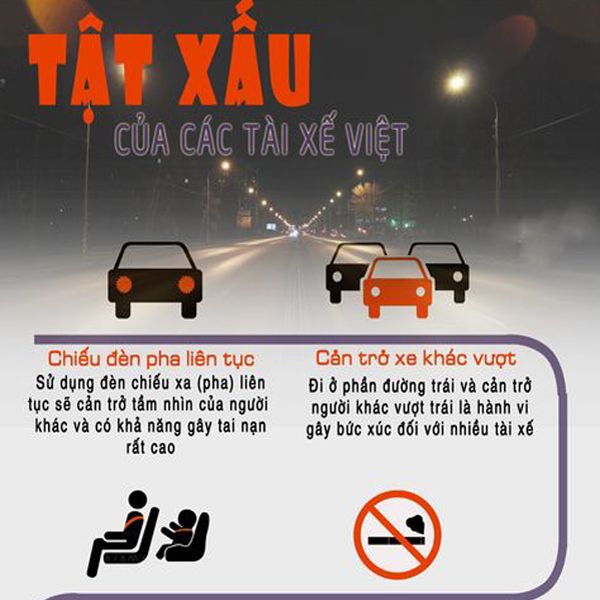Có rất nhiều các thói quen xấu khi lái xe mà nhiều bác tài cần phải từ bỏ như: Chiếu đèn pha liên tục, Bấm còi xe to, Bút thuốc lá, Uống rượu bia khi lái xe hay Nghe điện thoại khi đang điều khiển phương tiện...